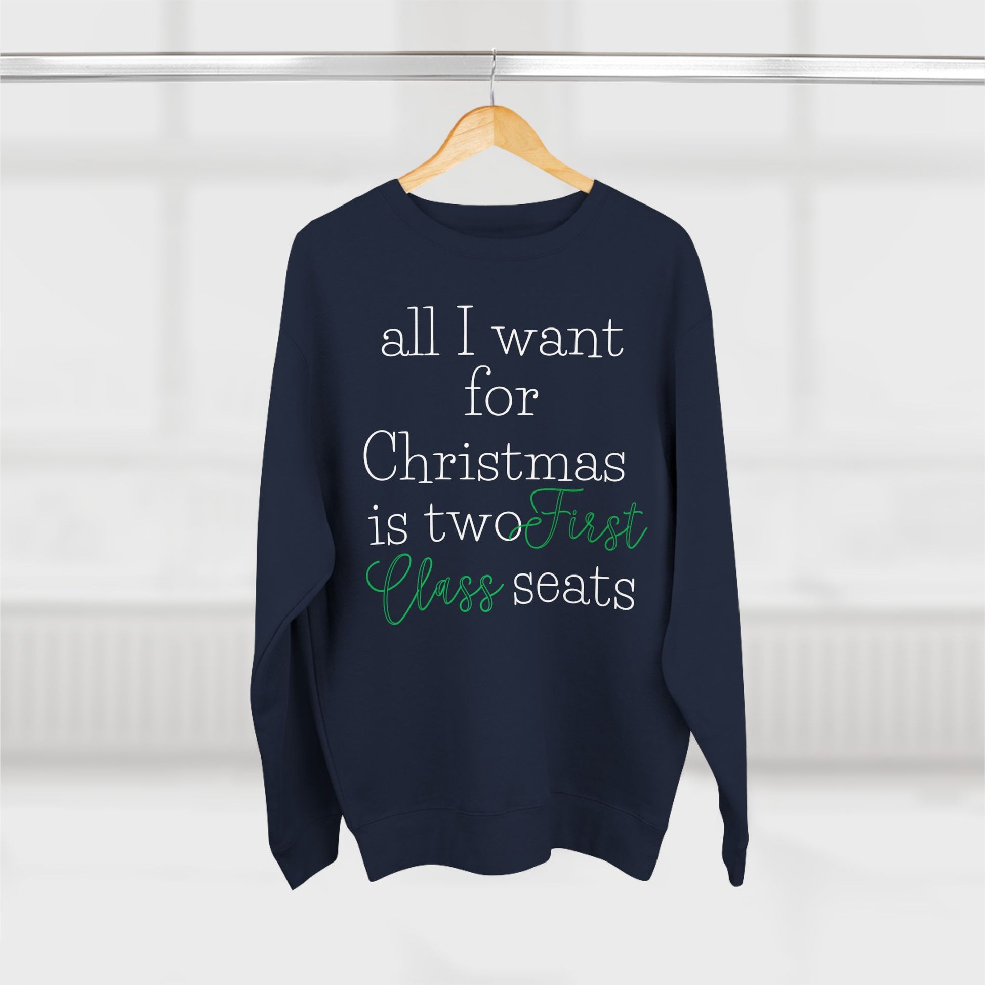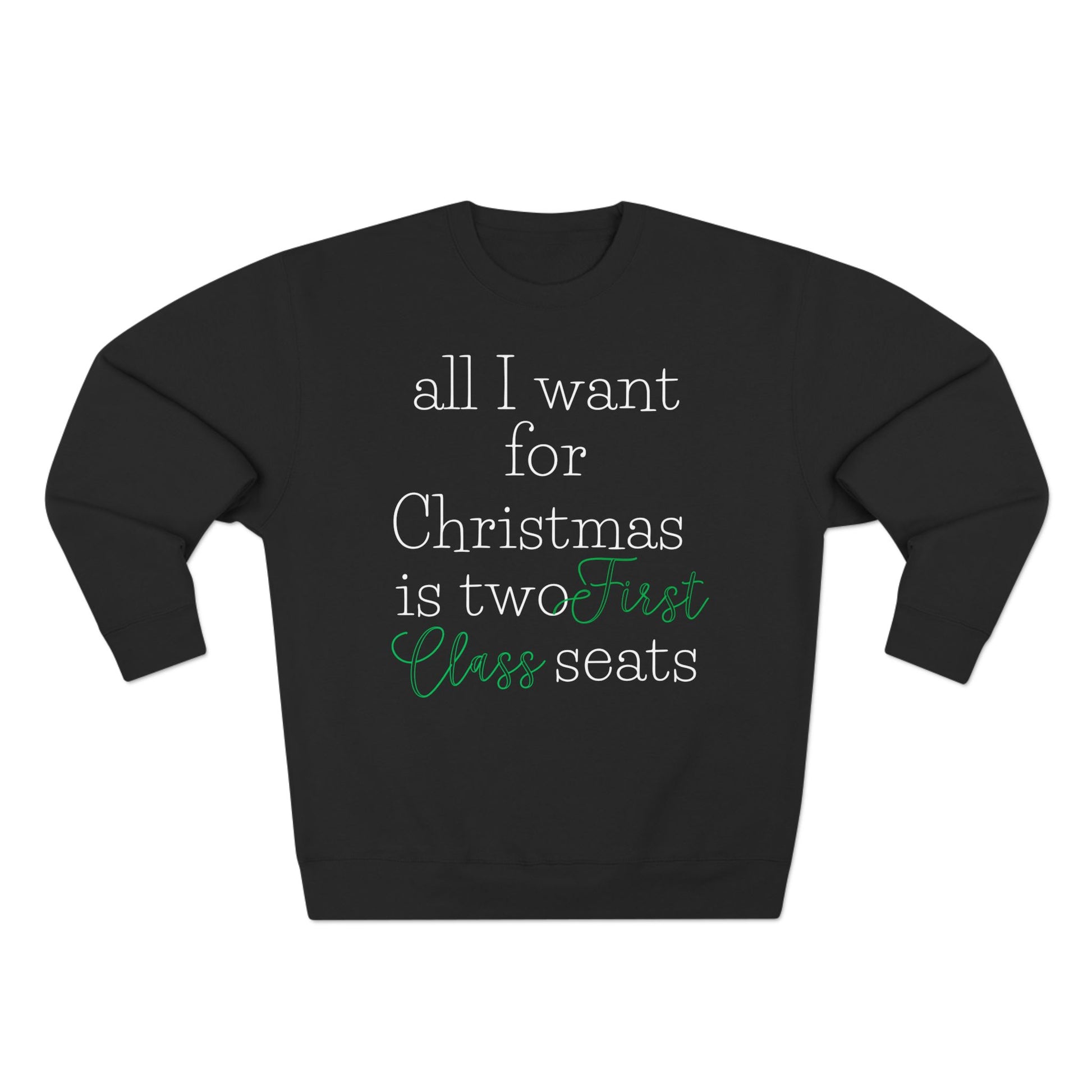 Upgrade your holiday wishlist with a sweatshirt that says what everyone’s really thinking. Our “All I Want for Christmas Is Two First Class Seats” sweatshirt is the perfect blend of cozy comfort and first-class humor. Whether you're a frequent flyer or just dream of stretching out at 35,000 feet, this sweatshirt adds a playful touch to your holiday style.